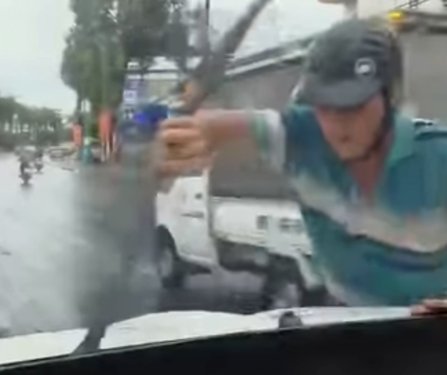 Người này còn bẻ gãy 2 cần gạt mưa trên ô tô và chỉ dừng lại khi có người dân cạnh đó đến can ngăn. Khi xảy ra vụ việc, tài xế ô tô im lặng, dùng thiết bị ghi hình toàn bộ sự việc.