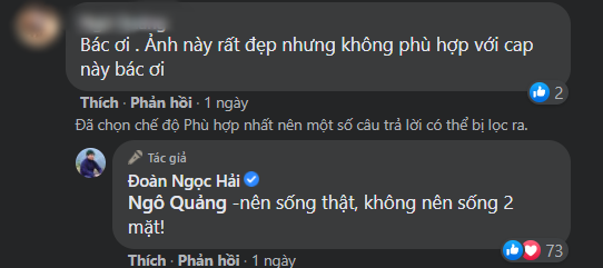 Ngay sau đó, ông Đoàn Ngọc Hải đã thẳng thắn đáp trả bình luận này: "Nên sống thật, không nên sống 2 mặt". Câu trả lời thẳng thắn của ông Hải đã nhận được sự đồng tình của rất nhiều người.