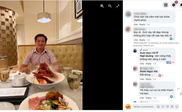 Mới đây, trong ngày cuối cùng của năm cũ 2021, ông Đoàn Ngọc Hải đã đăng tải hình ảnh chụp lại bữa ăn tối tại nhà hàng sang trọng với hải sản, tôm hùm... và gửi lời cảm ơn đến "bà con cô bác ở trong và ngoài nước đã ủng hộ cho Quỹ vì đồng bào".
