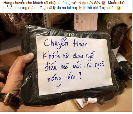 Và mới đây, trong những ngày nắng nóng đỉnh điểm thế này, câu chuyện của một vị khách ẩm ương với lý do từ chối nhận hàng được chia sẻ lên mạng xã hội khiến nhiều người vừa tức vừa buồn cười. "Hàng chuyển cho khách rồi nhận hoàn lại với lý do này đây. Muốn chửi lắm nhưng mà nghĩ lại cái lý do nó lại hợp lý không thể cãi được luôn. Nóng gì nóng quá trời quá đất luôn", dòng chia sẻ trên mạng xã hội. Kèm theo đó là hình ảnh gói hàng được bọc cẩn thận bằng lớp nilon màu đen, nhưng dòng chữ ghi lý do hoàn hàng bên ngoài lại khiến shipper mà cả chủ shop phải "phát hỏa". "Đang ngồi điều hòa mát, ra ngoài nóng lắm!", dòng chữ ngắn ngủi giải thích đầy đủ lý do không nhận hàng.