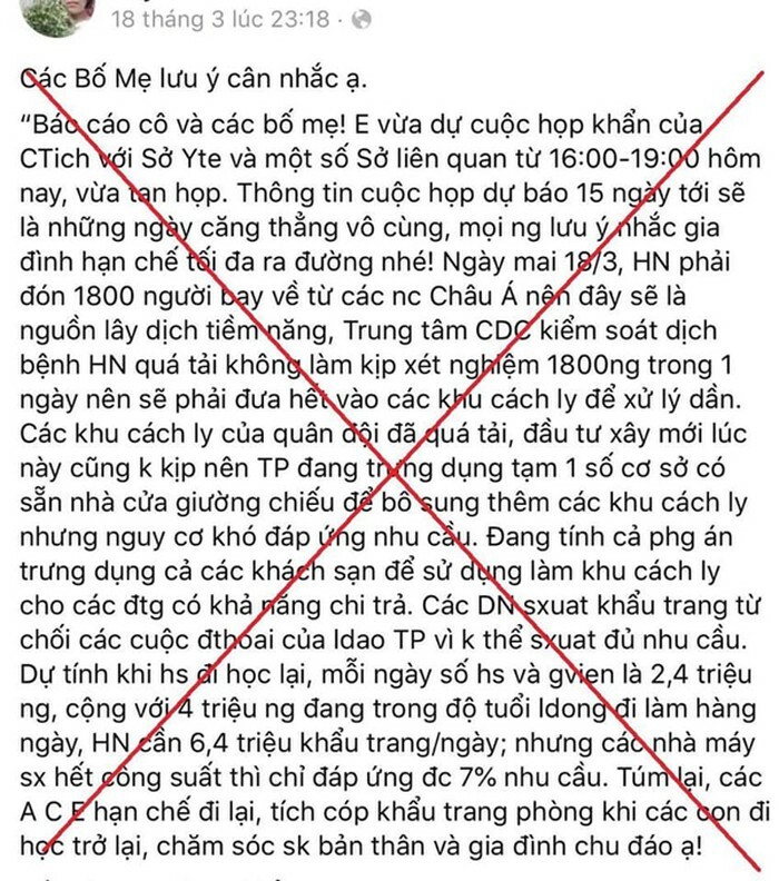 Theo kết quả xác minh, ngày 18/3, hai phụ nữ đăng trên Facebook cá nhân nội dung "vừa tham dự cuộc họp khẩn giữa Chủ tịch UBND Hà Nội và Sở Y tế thông tin, 15 ngày tới sẽ căng thẳng vô cùng. Trung tâm kiểm soát dịch bệnh Hà Nội quá tải không làm xét nghiệm kịp 1.800 người trong một ngày nên phải đưa hết vào các khu cách ly để xử lý dần".