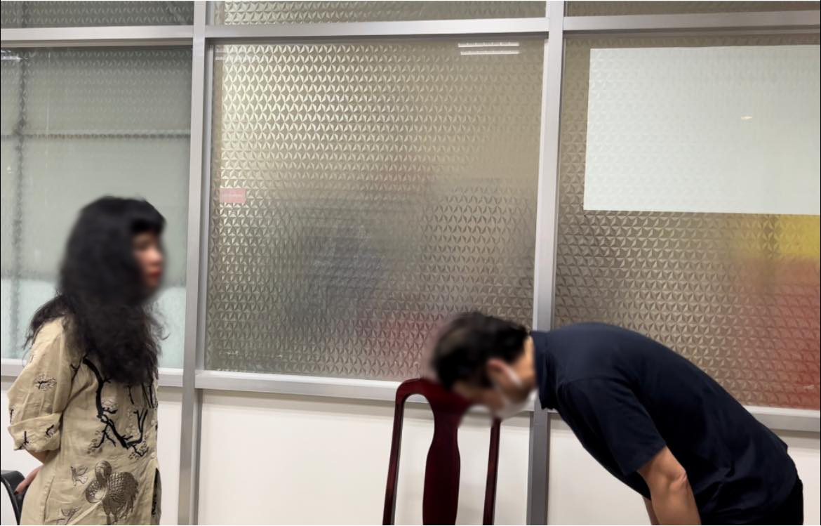 Chỉ đến khi người nhân viên đi cùng bất ngờ đánh thức chị, đồng thời giơ điện thoại phần note ra trước mặt và cảnh báo đang bị quay lén, chị mới thực sự hoảng hốt, nhìn chằm chằm vào người đàn ông ngoại quốc.