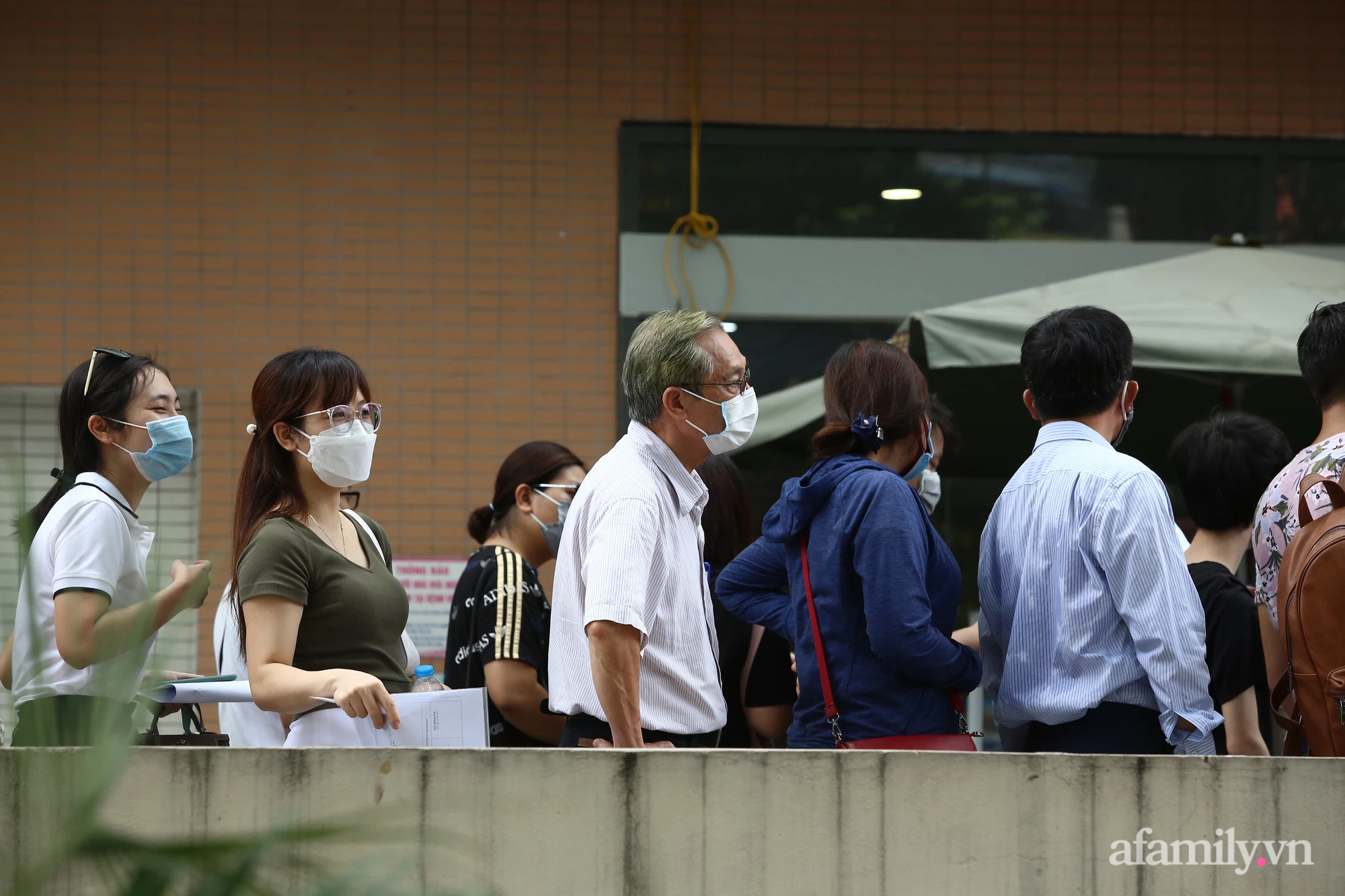 Chiều 22/7, hàng trăm người là cán bộ, công nhân viên của một số doanh nghiệp tập trung trong khuôn viên bệnh viện để chờ đăng ký tiêm vaccine phòng Covid-19. Do lượng người lớn, việc đảm bảo giãn cách không thể thực hiện, mọi người chen chúc, nhích từng bước để tới được bàn đăng ký.