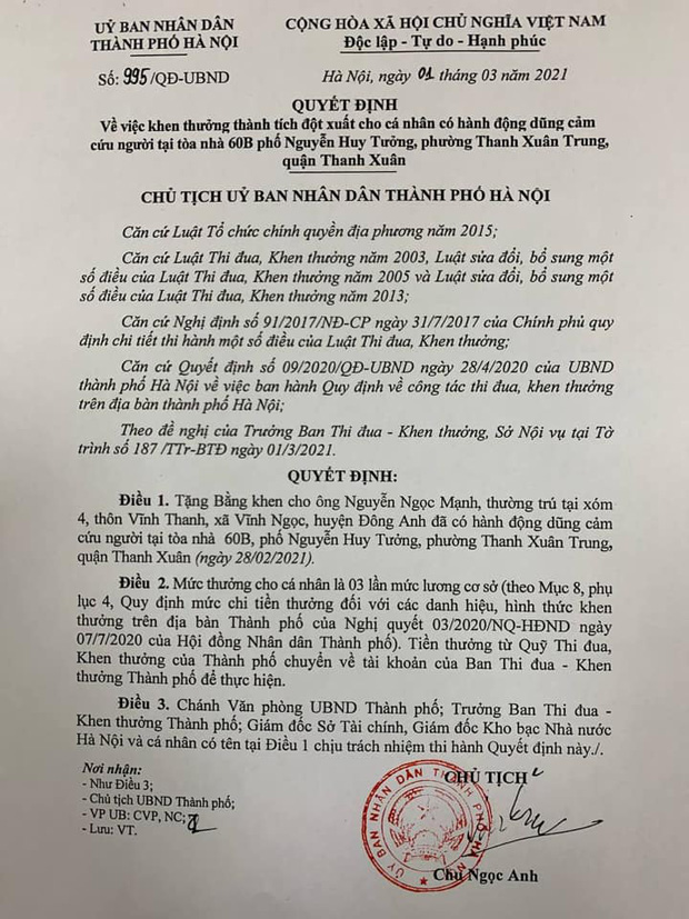 Theo đó, ông Chu Ngọc Anh - Chủ tịch UBND TP. Hà Nội đã có quyết định về việc khen thưởng thành tích đột xuất cho cá nhân có hành động dũng cảm cứu người, tại tòa nhà 60B Nguyễn Huy Tưởng, phường Thanh Xuân Trung, quận Thanh Xuân.