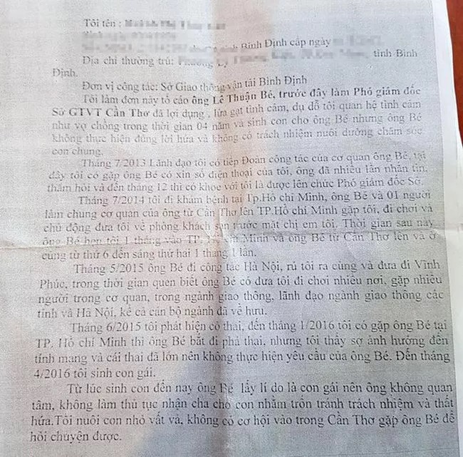 "Chủ tịch UBND TP nhận được đơn đề ngày 15/8, bà V. công tác tại Sở GTVT tỉnh Bình Định tố cáo ông B. đã quan hệ tình cảm như vợ chồng với bà và có 1 đứa con chung nhưng ông B. không thực hiện đúng lời hứa, không có trách nhiệm nuôi dưỡng, chăm sóc con chung", văn bản của Văn phòng UBND TP Cần Thơ gửi GĐ Sở GTVT nêu.