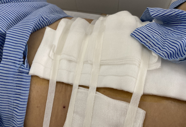 Bệnh nhân là chị P.T.N. (SN 1971) được chuyển vào viện từ một phòng khám tư vào sáng 16/6 trong tình trạng choáng, huyết áp tụt, vã mồ hôi, niêm mạc nhợt nhạt, mạch còn nhưng rời rạc. Bệnh nhân có nhiều vết thương vùng hạ sườn phải 3cm thấu bụng.