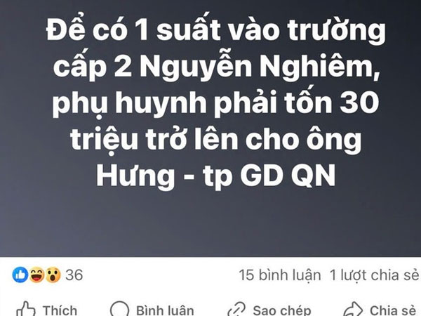 Theo ông Hưng, một chủ tài khoản trên mạng xã hội Facebook đã đăng nội dung ghi: “Để có 1 suất vào trường cấp 2 (THCS) Nguyễn Nghiêm, phụ huynh phải tốn 30 triệu trở lên cho ông Hưng - tp GD QN”.