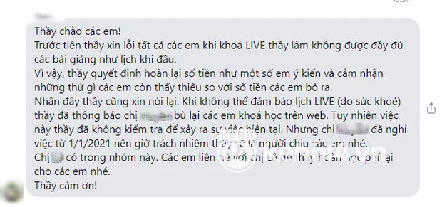 Bên cạnh đó, những lúc thầy T.N bận dạy live, đã giao cho 1 trợ giảng khác thực hiện. Song người trợ giảng này đã không dạy học, thầy T.N cũng không kiểm tra lại. Vậy nên thầy T.N quyết định sẽ hoàn lại số tiền học phí như ý kiến của một số bạn học sinh.