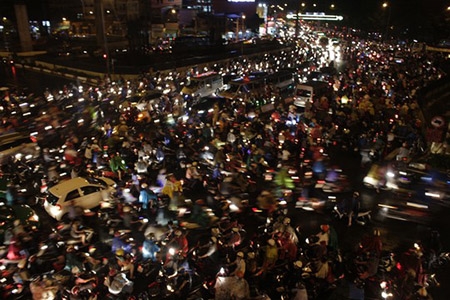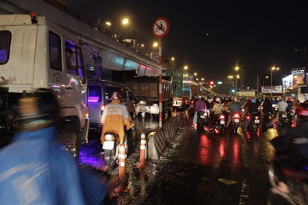 Hai hướng của Xa lộ Hà Nội đông nghẹt, đoàn người kéo dài gần 1 km. Nhiều xe máy di chuyển trên hướng này bất chấp nguy hiểm chạy lên cầu vượt hoặc len lỏi qua các kẽ hở của xe tải để tìm đường thoát khỏi đám kẹt xe.