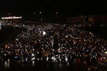 Khoảng 17 giờ hôm nay (28-9), giao thông qua ngã tư Thủ Đức hết sức hỗn loạn. Hàng ngàn người đã phải chôn chân dưới mưa, xe cấp cứu cũng không thể di chuyển được.