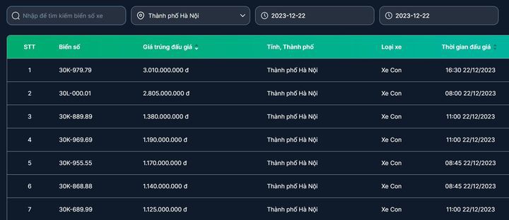 Video: Biển số ngũ quý 5 Hà Nội đấu giá hơn 14 tỷ (Nguồn: VTV24). Sáng 22/12/2023 vừa qua, Công ty Đấu giá hợp danh Việt Nam tiếp tục đưa hàng loạt biển số xe ô tô lên sàn đấu giá. Trong đó, biển số 30L-000.01 của Hà Nội gây bất ngờ khi trúng giá số tiền lên đến 2,805 tỷ đồng. Theo ghi nhận trong phiên đấu giá, biển số này được nhiều người tham gia trả giá và đẩy giá lên cao chỉ sau vài phút đầu.