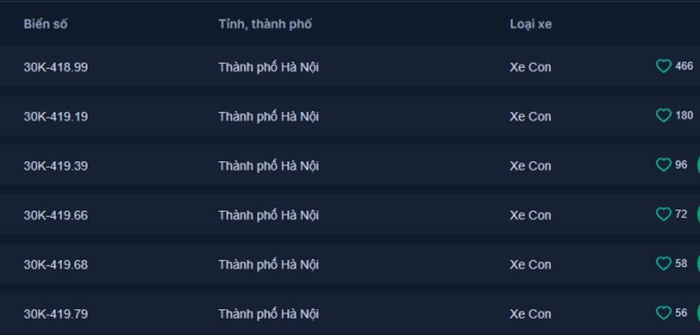 Tuy nhiên, biển số xe con ở Hà Nội được nhiều người quan tâm nhất đến hiện nay không phải là biển ngũ quý hay tứ quý mà là biển 30K-418.99 với 466 người quan tâm. Sau đó là biển tứ quý 9 (30K-399.99) với 336 người quan tâm.