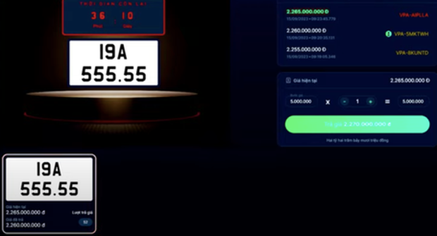 15/09/2023 17:44Biển số 'VIP' 19A-555.55 đã được trả giá gần 2,7 tỉ đồng sau hơn 30 phút đấu giá