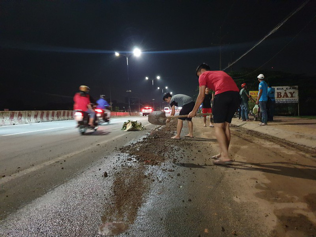 Lo sợ sự cố tiếp tục xảy ra, khi lực lượng chức năng chưa đến thì người dân đã cắm biển báo khu vực có nhớt để các phương tiện lưu thông chậm, đồng thời cùng nhau xúc đất đổ lên chỗ có nhớt để hạn chế trơn trợt.