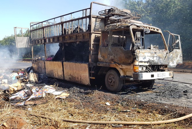 Vụ việc đã khiến chiếc xe tải cùng số hàng hóa là bìa cát tông trên xe gần như bị thiêu rụi, chiếc xe chỉ còn lại bộ khung sắt.