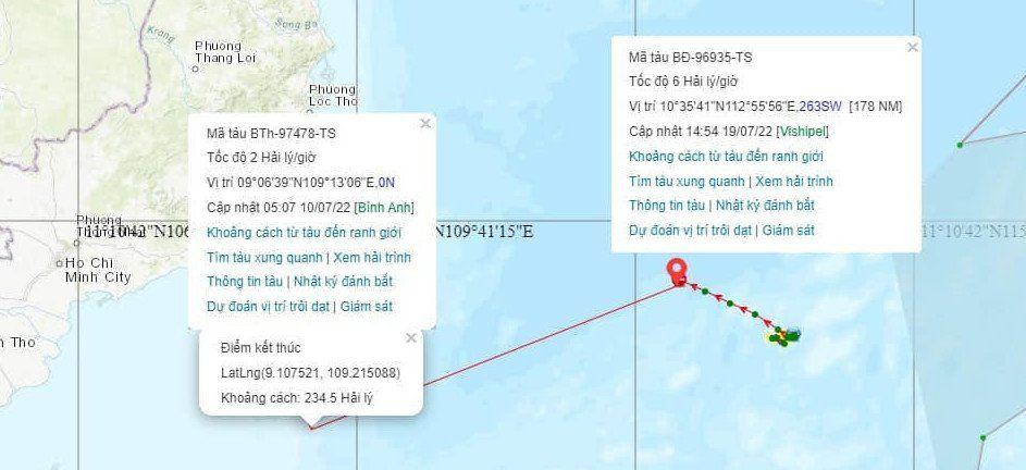 Đến 5 giờ ngày 10/7/2022 trên đường hành trình về lại cảng Phan Thiết thì bị mất liên lạc (không có tín hiệu máy giám sát hành trình), tại tọa độ (090 06’ N -:- 1090 13’ E), cách Phan Thiết khoảng 121 hải lý về hướng Nam.