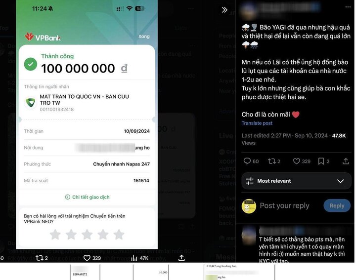 Do ảnh hưởng của cơn bão số 3 (bão Yagi), thời gian qua, rất nhiều nhà hảo tâm, cơ quan, đơn vị cùng người dân cả nước đã chung tay quyên góp, chuyển tiền để ủng hộ những nạn nhân bị ảnh hưởng.