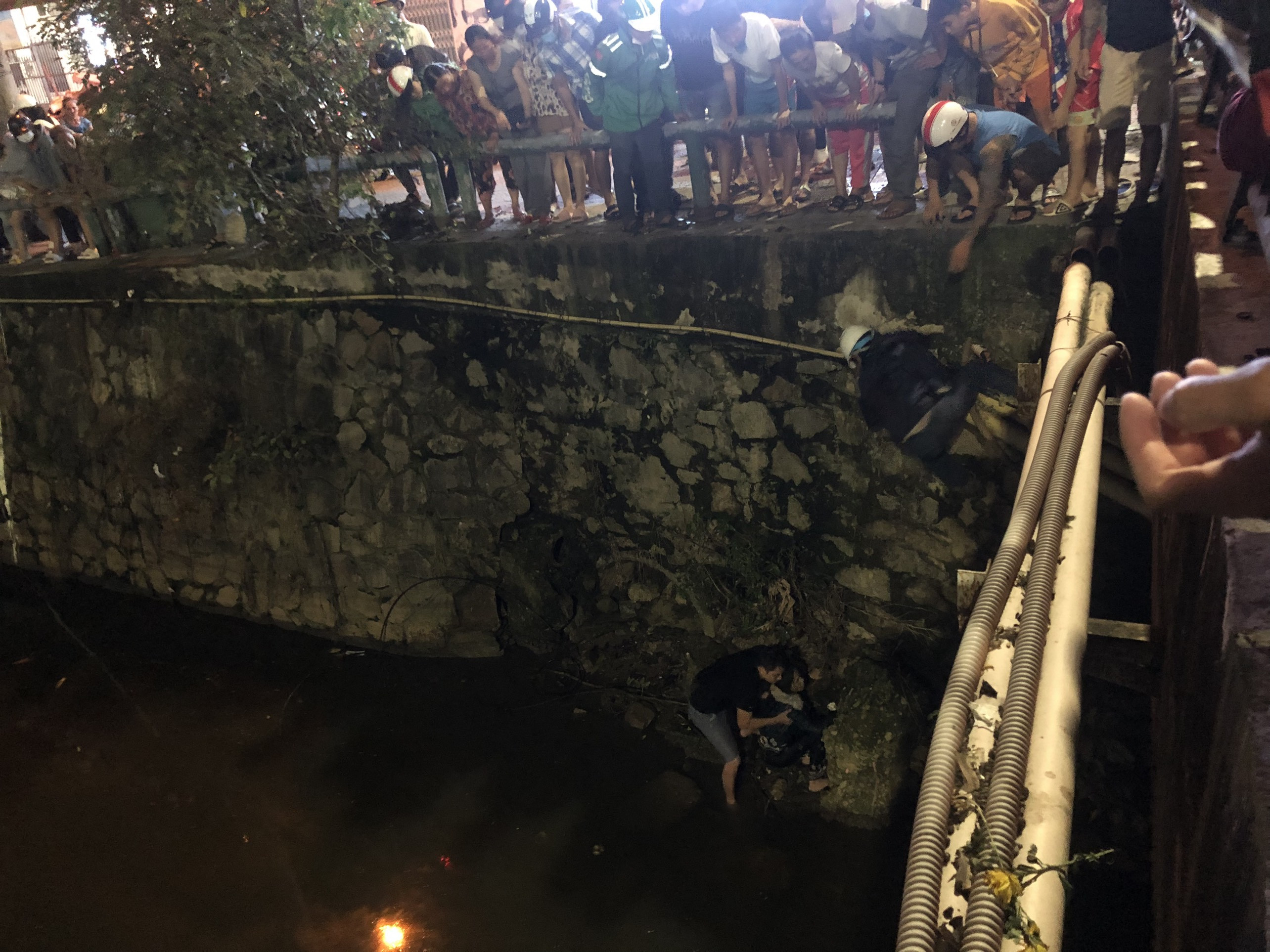 Phát hiện sự việc, nhiều người đi đường dừng xe, hô hoán người dân đến ứng cứu trong lúc cô gái đang vật lớn giữa dòng nước sông chảy xiết. Trong phút chốc, một chàng trai trẻ từ trong quán ăn gần hiện trường, không chút đắn đo lao mình xuống sông ứng cứu.
