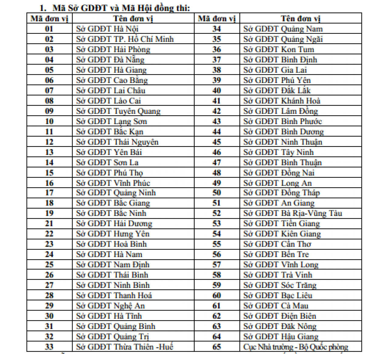 Bộ GD-ĐT cũng thông tin mã Sở GD-ĐT và mã hội đồng thi trong kỳ thi tốt nghiệp THPT năm 2025 như sau:
