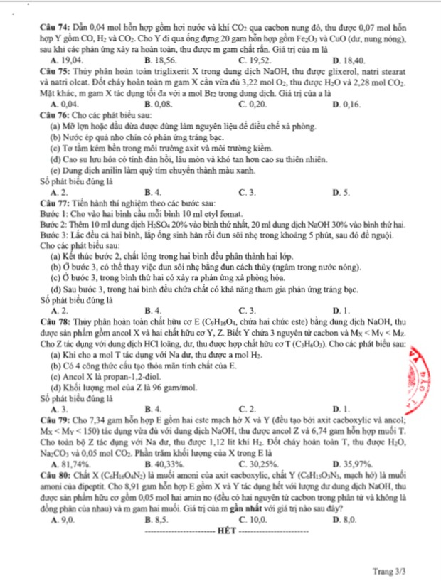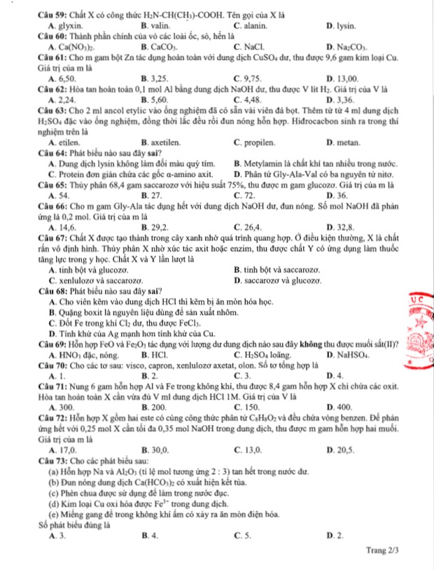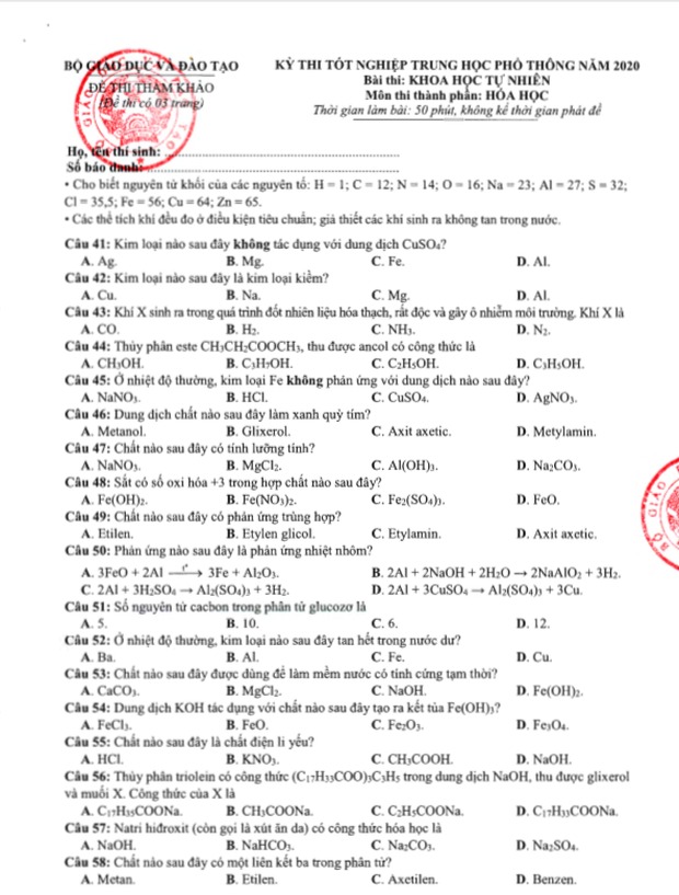 Đề thi tham khảo kỳ thi tốt nghiệp THPT năm 2020 Môn Hóa học