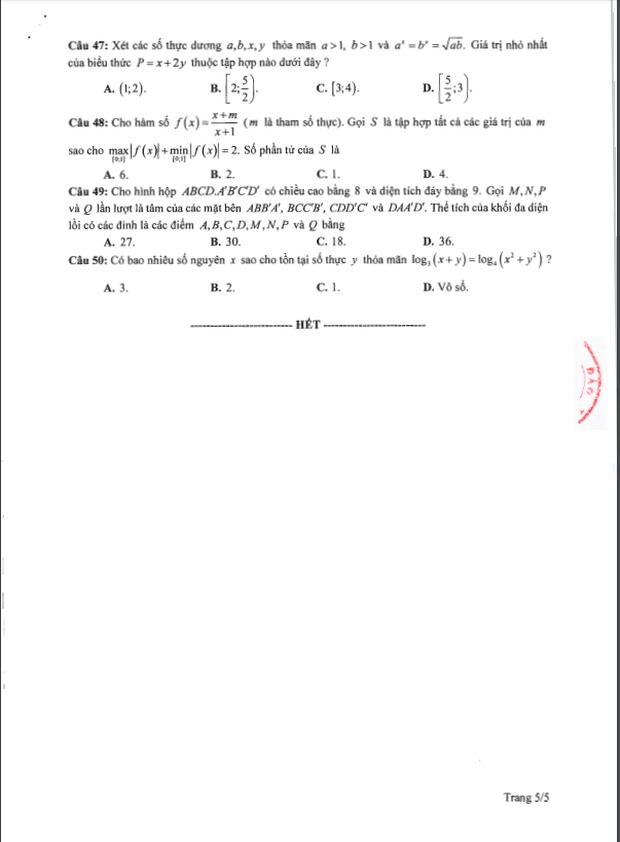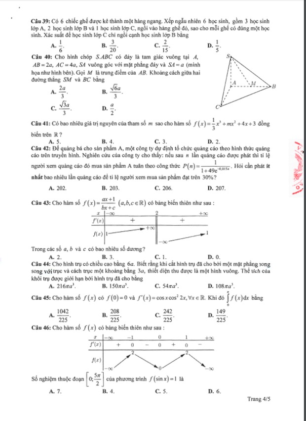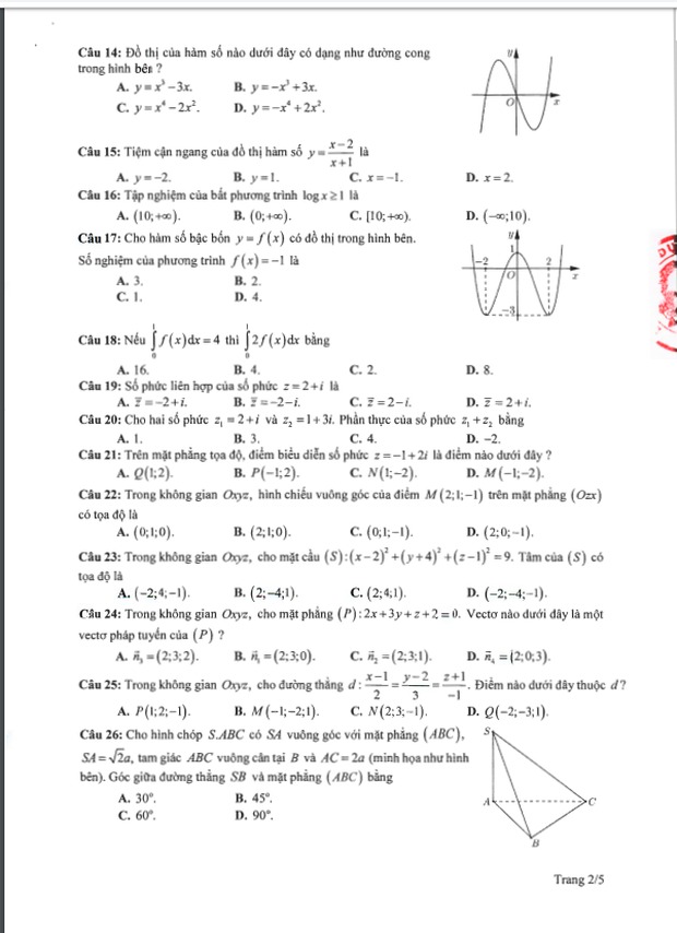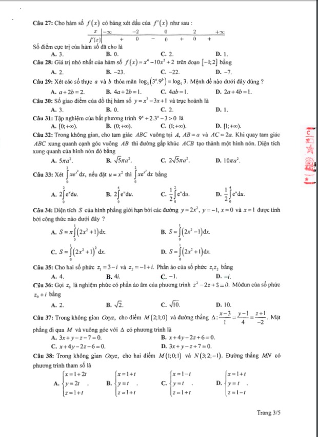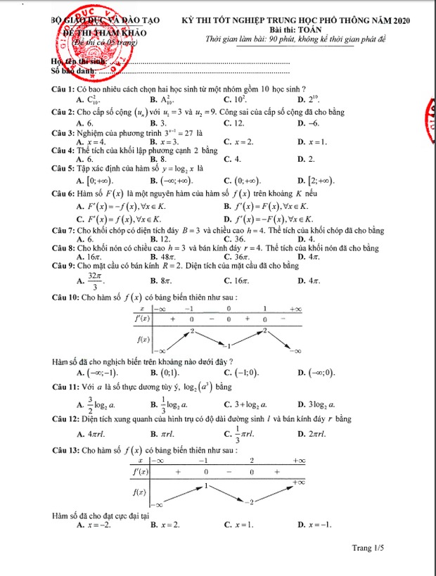 Đề thi tham khảo kỳ thi tốt nghiệp THPT năm 2020 Môn Toán