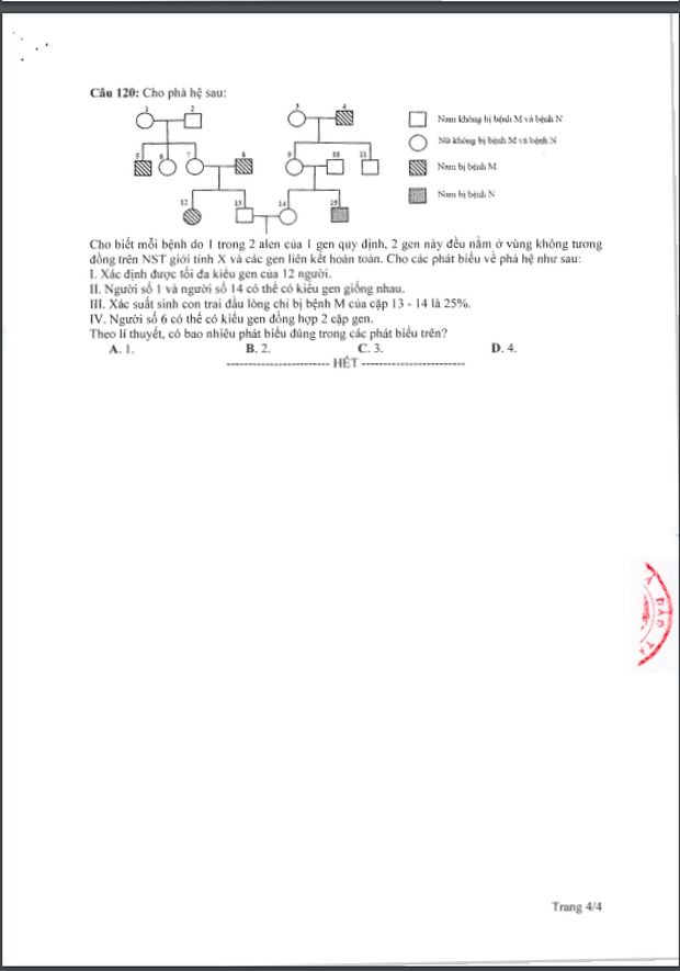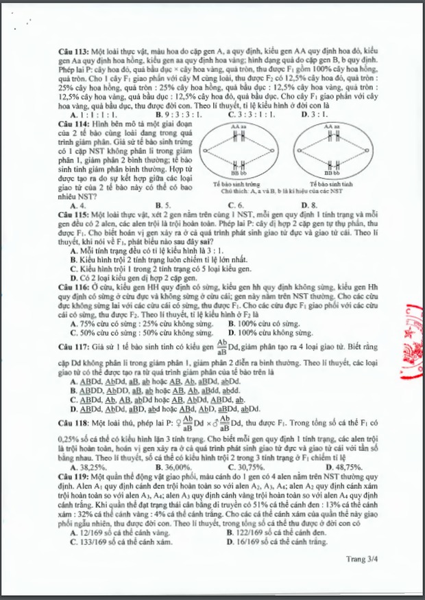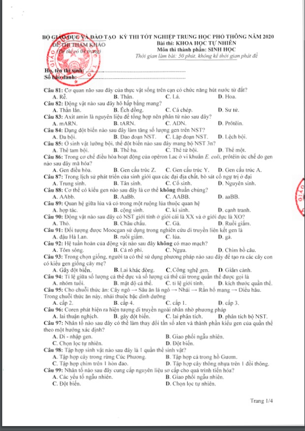 Đề thi tham khảo kỳ thi tốt nghiệp THPT năm 2020 Môn Sinh học