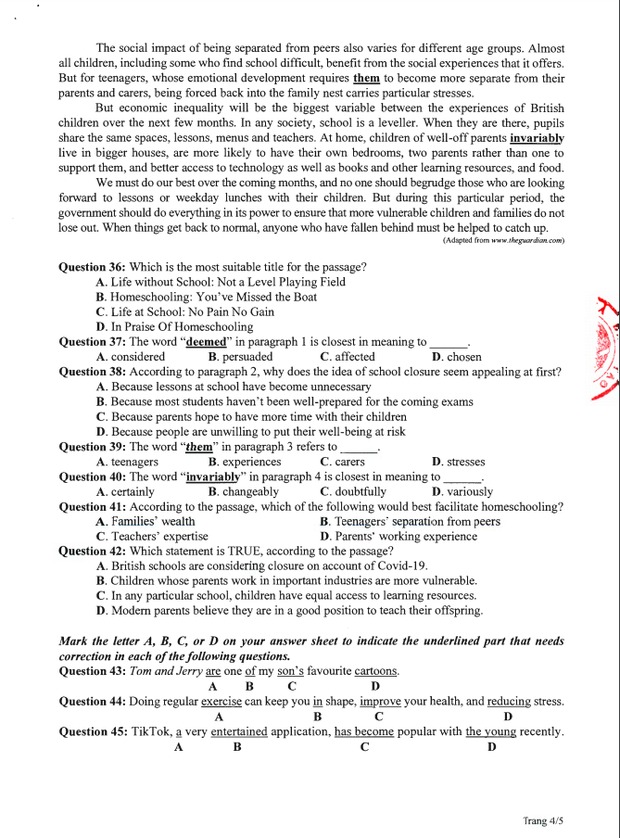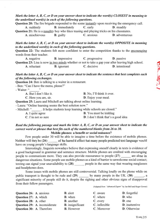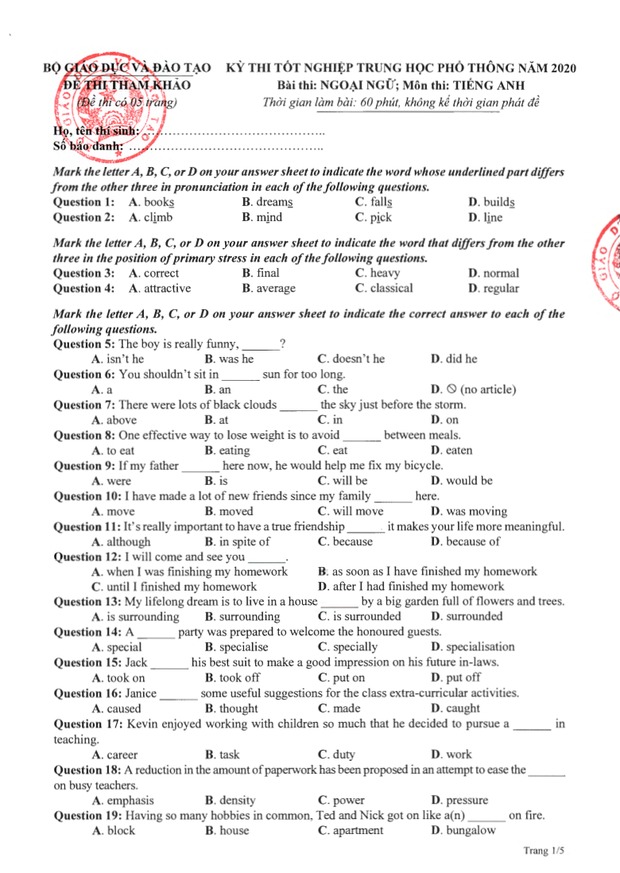 Đề thi tham khảo kỳ thi tốt nghiệp THPT năm 2020 Môn Tiếng Anh