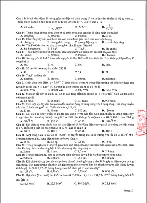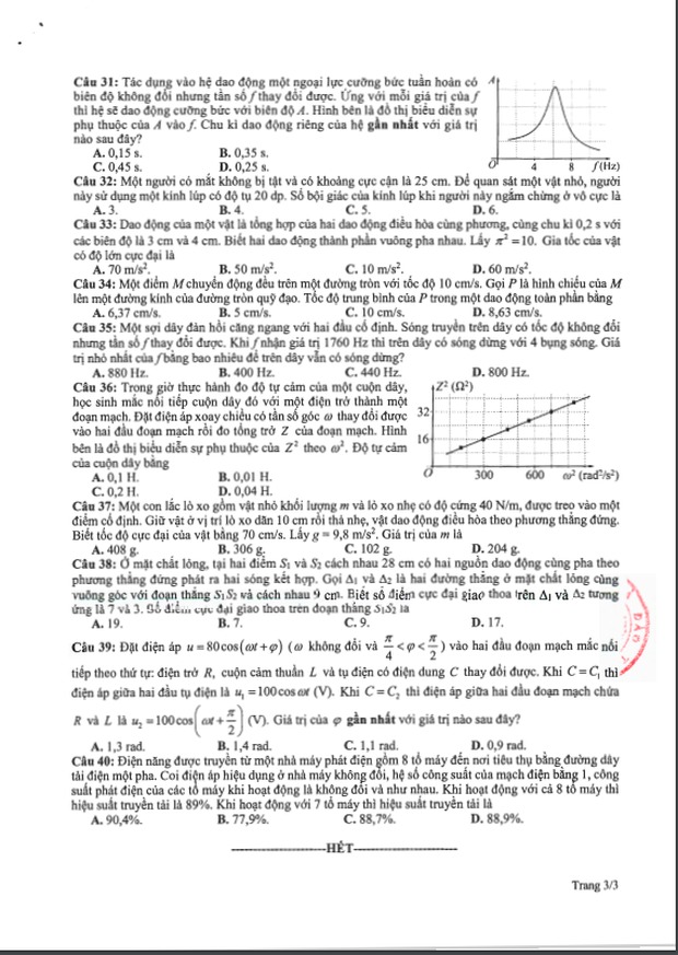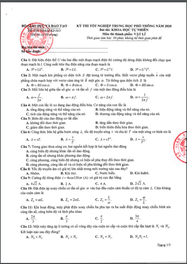 Đề thi tham khảo kỳ thi tốt nghiệp THPT năm 2020 Môn Vật lý