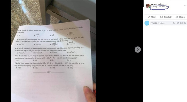 Tuy nhiên, trên trang cá nhân có tên N.V.Q đã đăng lên đề thi môn Toán vào lúc 16h01.