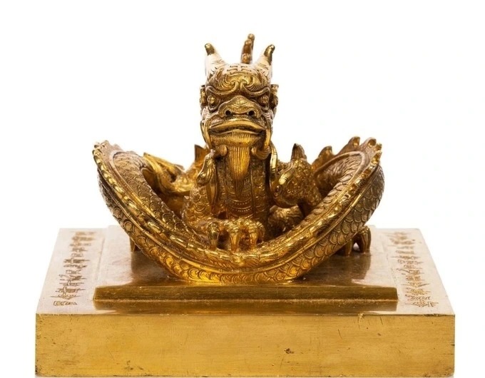 Thông tin mô tả của đơn vị tổ chức đấu giá cho biết, đây là kim ấn triều Nguyễn được làm bằng vàng quý hiếm, đúc vào năm 1823 triều Minh Mạng (1820-1841), gồm một đế vuông kép xếp chồng lên nhau. Kích thước của cổ vật cao 10,4cm, mặt ấn hình vuông (13,8cm x 13,7cm), nặng 10,78kg. Quai ấn đúc hình con rồng uốn khúc, đầu ngẩng cao, mắt nhìn về phía trước, tư thế vững vàng. Trán rồng có khắc chữ, vây lưng và đuôi rồng dựng đứng. Bốn chân rồng đúc hiển thị rõ năm móng.