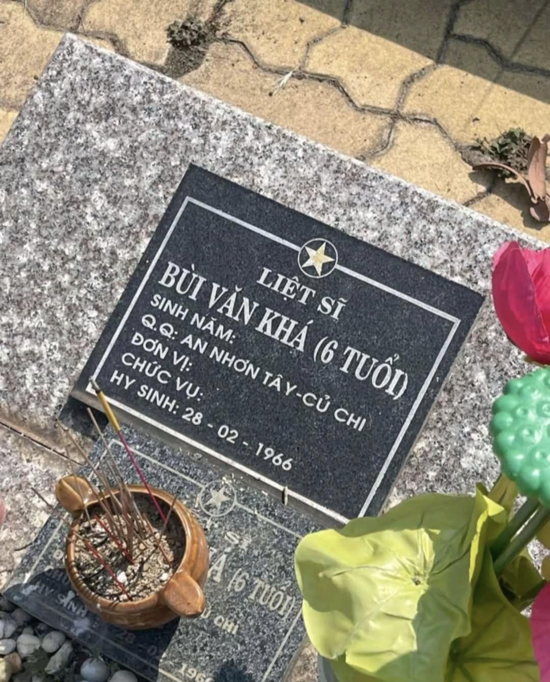 Mới đây, trên mạng xã hội xuất hiện thông tin về một "liệt sĩ 6 tuổi" khiến dư luận xôn xao. Cụ thể, một tài khoản Facebook chia sẻ hình ảnh tấm bia mộ mang tên liệt sĩ Bùi Văn Khá, quê quán xã An Nhơn Tây, huyện Củ Chi (TPHCM), kèm theo thông tin người này hy sinh ngày 28/2/1966, khi mới 6 tuổi.