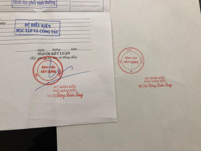 Phía bệnh viện Xây dựng đưa cho chúng tôi xem con dấu thật được dùng để đóng trên các giấy khám sức khỏe của bệnh viện. Qua so sánh, có thể thấy dấu giả và giấu thật gần như giống nhau hoàn toàn, cực khó để có thể phát hiện bằng mắt thường.