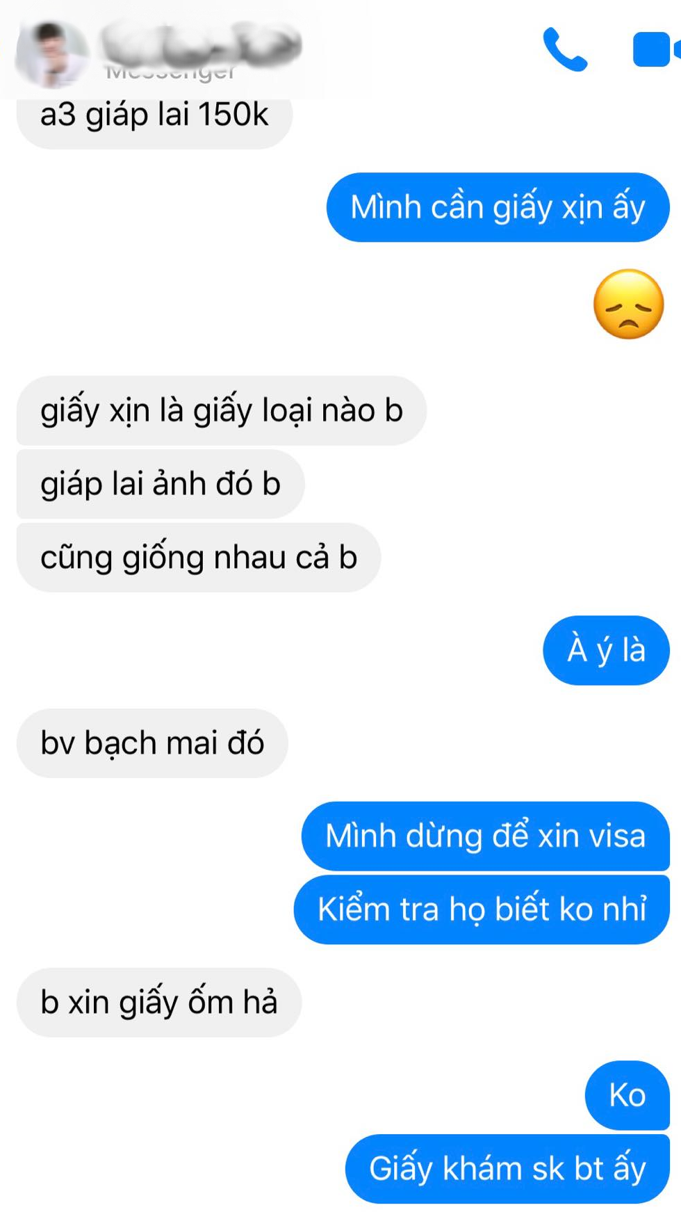 Sau khi được người bán "tư vấn", chúng tôi quyết định đặt mua 1 giấy khám sức khỏe "của bệnh viện Xây dựng" với giá 130.000 đồng, có đầy đủ chứng nhận đạt yêu cầu sức khỏe, không mắc các bệnh lý cơ bản. Tài khoản Facebook của người bán nhanh chóng hỏi các thông tin cá nhân cần thiết, đồng thời yêu cầu gửi ảnh 4x6 để dán vào giấy khám.