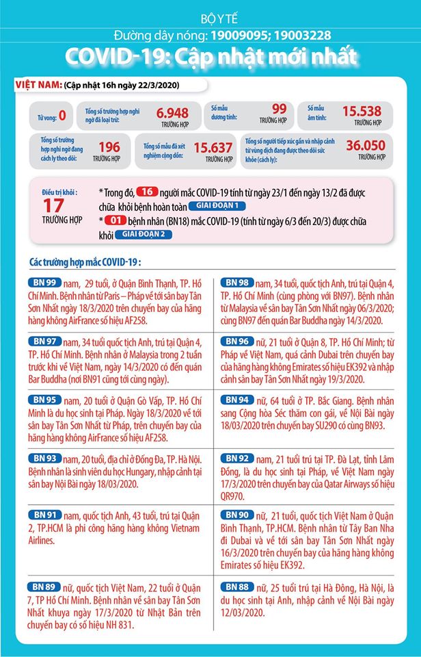 Ca bệnh 96 (BN96): Bệnh nhân nữ, 21 tuổi, địa chỉ ở quận 8, TP.HCM. Trong 2 tuần trước khi về Việt Nam, bệnh nhân đã đi tới các quốc gia Bỉ, Đức, Cộng hoà Czech, Pháp. Bệnh nhân từ Pháp về Việt Nam, quá cảnh Dubai trên chuyến bay của hãng hàng không Emirates số hiệu EK392, số ghế 30E và nhập cảnh sân bay Tân Sơn Nhất ngày 19/3.