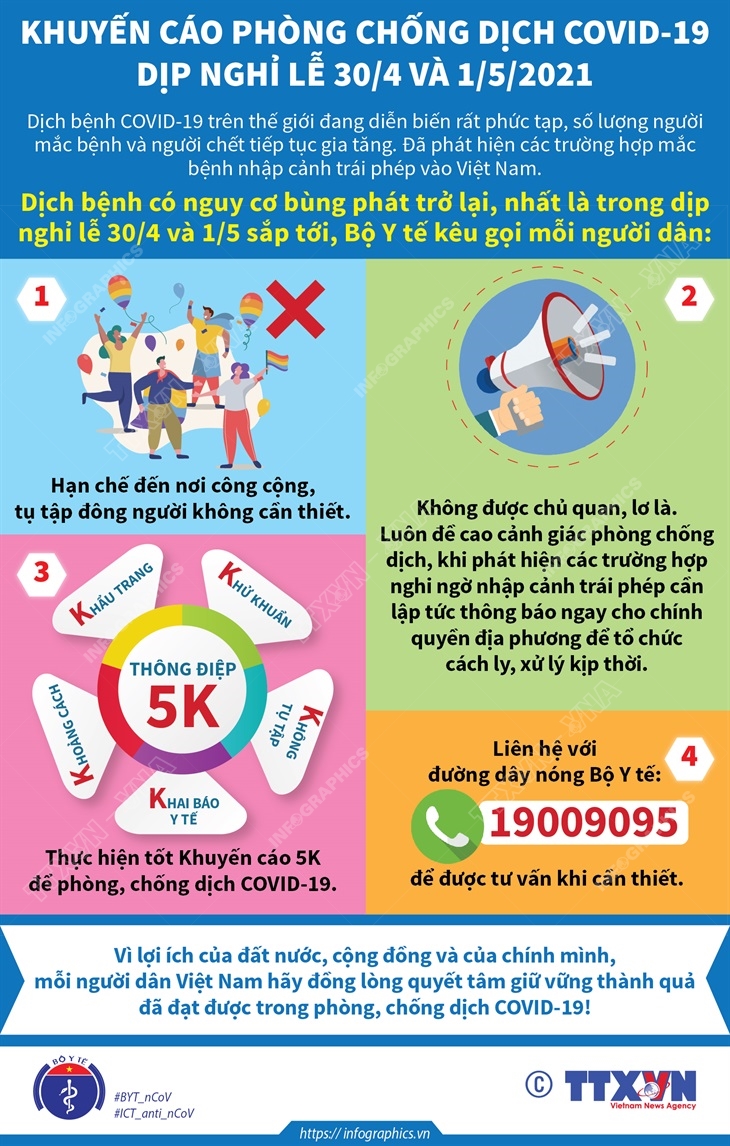 Trước tình hình dịch bệnh trên thế giới đang diễn biến phức tạp, số lượng người mắc bệnh và người chết tiếp tục gia tăng. Thậm, chí nước ta cũng đã phát hiện các trường hợp mắc bệnh nhập cảnh trái phép. Để ngăn chặn nguy cơ dịch bùng phát trở lại, nhất là dịp nghỉ lễ 30/4 và 1/5 sắp tới, Bộ Y tế kêu gọi mỗi người dân chủ động thực hiện các biện pháp phòng chống dịch bệnh. Cụ thể như sau: