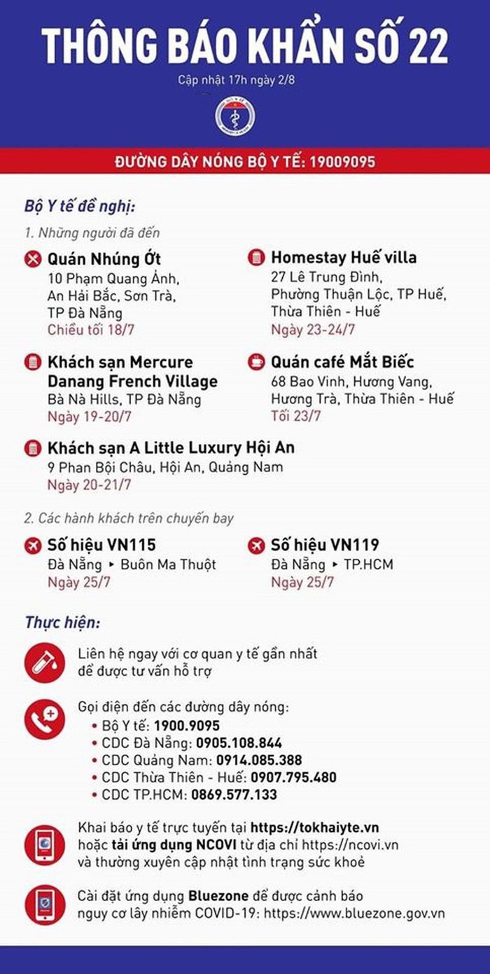 Tối 2/8, Bộ Y tế phát đi thông báo khẩn số 22, đề nghị những người từng đến một loạt địa điểm tại Huế và những hành khách đi trên các chuyến bay sau liên hệ ngay với cơ sở y tế gần nhất.