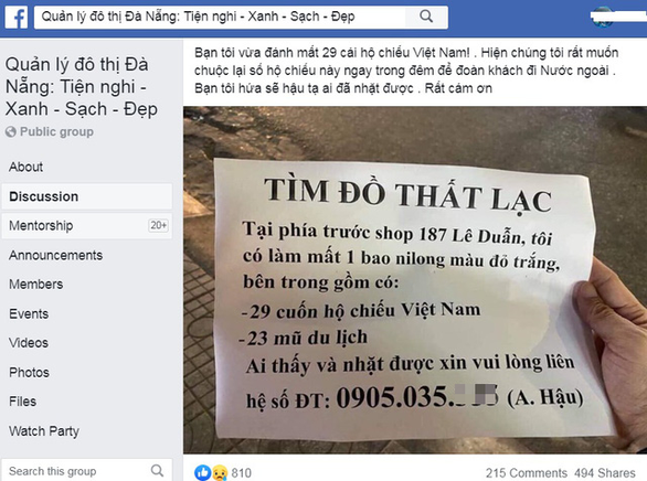 Trước đó, tối 20/1, trên Facebook Quản lý đô thị Đà Nẵng đăng bài viết về việc một người tên Hậu bị thất lạc đồ tại số 187 Lê Duẩn. Trong túi đồ có 29 cuốn hộ chiếu của đoàn khách Việt Nam đi Hàn Quốc tối mùng 1 Tết Canh tý.