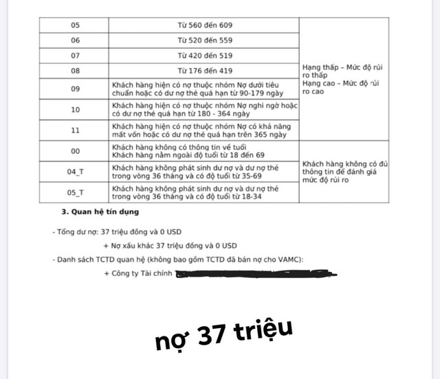 Tôi tải ứng dụng tra cứu thông tin của CIC trên điện thoại và khai thác báo cáo tín dụng cá nhân. Quả thực công ty tín dụng kia đã cố tình nói dối khi bảo rằng tôi không có khoản vay nào. Trên báo cáo, tôi đang có khoản nợ 37 triệu với công ty này (số tiền gốc ban đầu chỉ khoảng 10-20 triệu nhưng đã tăng lên sau khi cộng tiền lãi, phạt suốt hơn một năm), điểm tín dụng ở mức rất thấp, rơi xuống mức độ rủi ro 11.