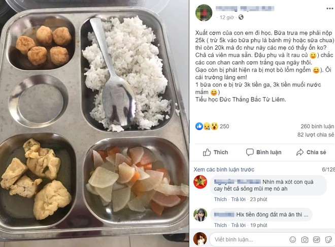 Được biết, chủ nhân của tài khoản Facebook này là chị L.A, có con học lớp 1 tại trường. Theo chị L.A., bức ảnh được chụp ngày 21/11. Sau khi đăng lên nhóm chat chung của lớp, nhiều người tỏ ra không hài lòng về khẩu phần ăn này.