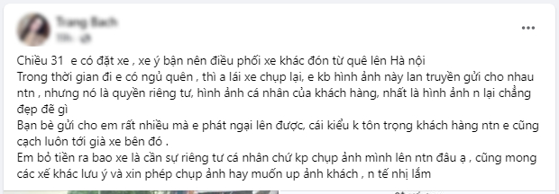 Tài khoản T.B chia sẻ, "Chiều 31/10, em có đặt xe, xe ý bận nên điều phối xe khác đón từ quê lên Hà Nội. Trong thời gian đi em có ngủ quên, thì anh lái xe chụp lại, em không biết hình ảnh này lan truyền gửi cho nhau như thế nào, nhưng nó là quyền riêng tư, hình ảnh cá nhân của khách hàng, nhất là hình ảnh nó lại chẳng đẹp đẽ gì.