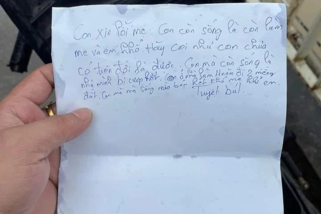 Trong lá thư để lại có nội dung: "Con xin lỗi mẹ. Con còn sống là làm mẹ và em khổ, hãy coi như chưa có con trên đời là được. Con mà còn sống là nhà mình bị cướp hết. Con ở nhà làm 11 năm đi 2 miếng đất. Con mà còn sống nữa bán hết, khổ mẹ, khổ em".