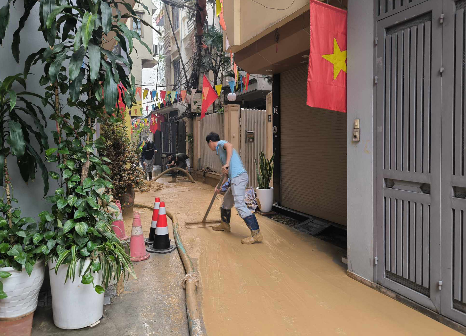 Về hướng khắc phục, chủ đầu tư đã chỉ đạo tư vấn và nhà thầu khẩn trương huy động 6 xe hút bùn, 2 xe rửa đường cùng 100 công nhân hút sạch vữa khoan và làm sạch bề mặt khu vực bị phụt vữa; theo dõi, túc trực tại hiện trường để theo dõi diễn biến, có biện pháp ứng phó kịp thời, đảm bảo an toàn và vệ sinh môi trường.