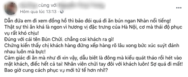 | Khách hàng nổi đoá khi bị nhân viên bún ngan Nhàn chửi bới và thái độ lặng thinh của chủ quán. |