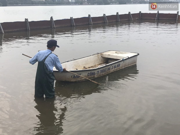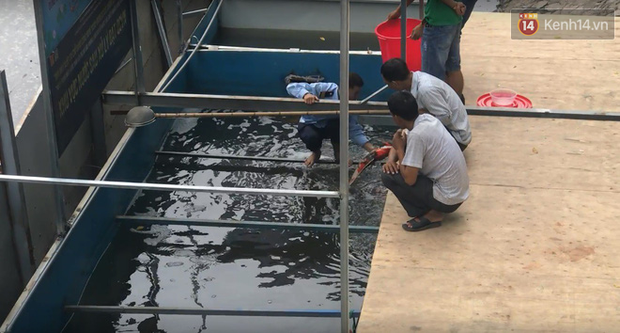 Ngay sau khi xuất hiện tình trạng cá chết, bảo vệ và những người trông coi tại đây đã tiến hành vớt cá lên bờ.