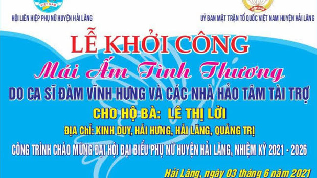 Trao đổi về việc ca sĩ Đàm Vĩnh Hưng và các nhà hảo tâm hỗ trợ xây "Mái ấm tình thương" tặng 2 phụ nữ có hoàn cảnh khó khăn tại xã Hải Lâm và xã Hải Hưng thuộc huyện Hải Lăng (Quảng Trị), chiều 15/10, ông Nguyễn Vĩnh Quyền - Chủ tịch Ủy ban Mặt trận Tổ quốc Việt Nam huyện Hải Lăng xác nhận thông tin này. Theo vị này, Đàm Vĩnh Hưng không trực tiếp về địa phương mà thông qua người đại diện, đề nghị địa phương khảo sát đối tượng để hỗ trợ.