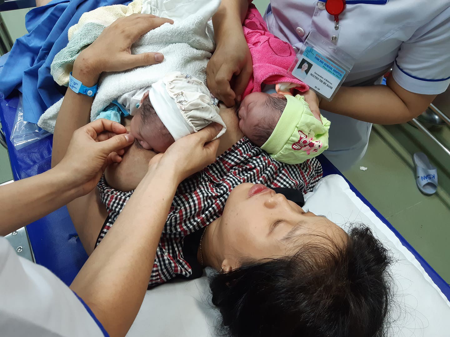 Sau khoảng 15 phút được hồi sức, bé đã khóc to, hồng hào, vận động tốt. Cả 2 cháu được cho nằm với mẹ theo kiểu "da kề da". Theo dõi sau sinh, cả 3 mẹ con đều ổn định.