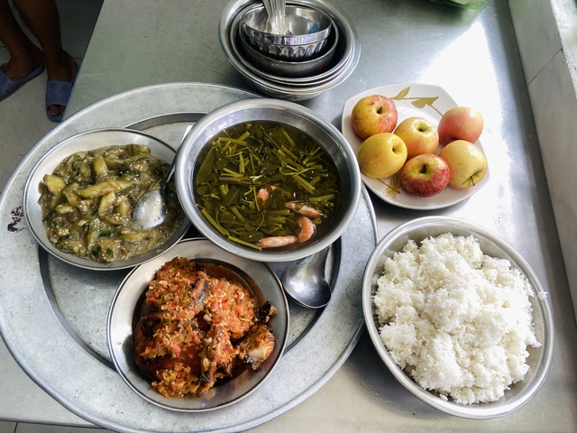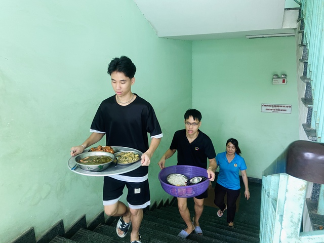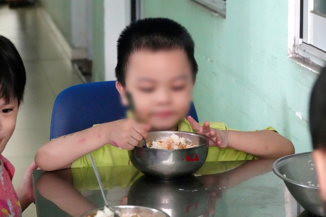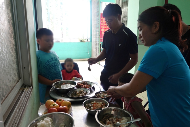 Bên cạnh đó, các bữa ăn của các cháu bé cũng được các nhân viên trung tâm Bảo trợ trẻ em Tam Bình chuẩn bị chu đáo. Các bé lớn có thể tự xúc sẽ được xắp xếp ra ngoài bàn ăn. Bữa trưa của các bé có cơm trắng ăn cùng với cá sốt, cà bung, canh tôm và hoa quả tráng miệng. Các em tự lập và ngồi ăn uống rất nghiêm chỉnh dưới sự hỗ trợ của các cô chú tại trung tâm. Trong khi đó, các bé nhỏ hơn thì được các cô chú chuẩn bị canh trứng và bón cho lần lượt từng bạn.