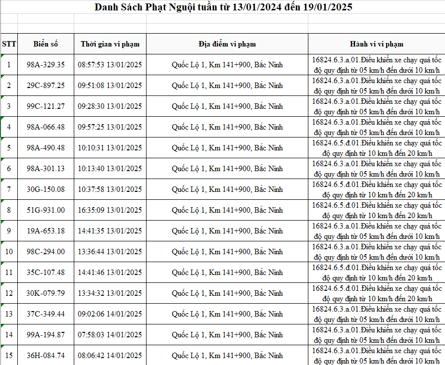 Cũng trong tháng 1, lực lượng CSGT ghi nhận 568 trường hợp xử phat "nguội" trong tuần từ 13/1 đến 19/1, với hành vi vi phạm chủ yếu là "điều khiển xe vượt quá tốc độ quy định". Người dân có thể truy cập danh sách tại link sau đây.
