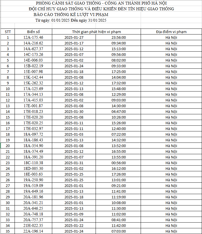 Cụ thể, danh sách các phương tiện vi phạm không chấp hành hiệu lệnh của đèn tín hiệu giao thông: