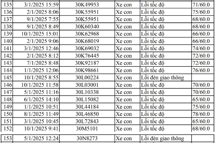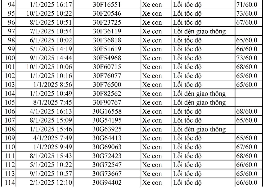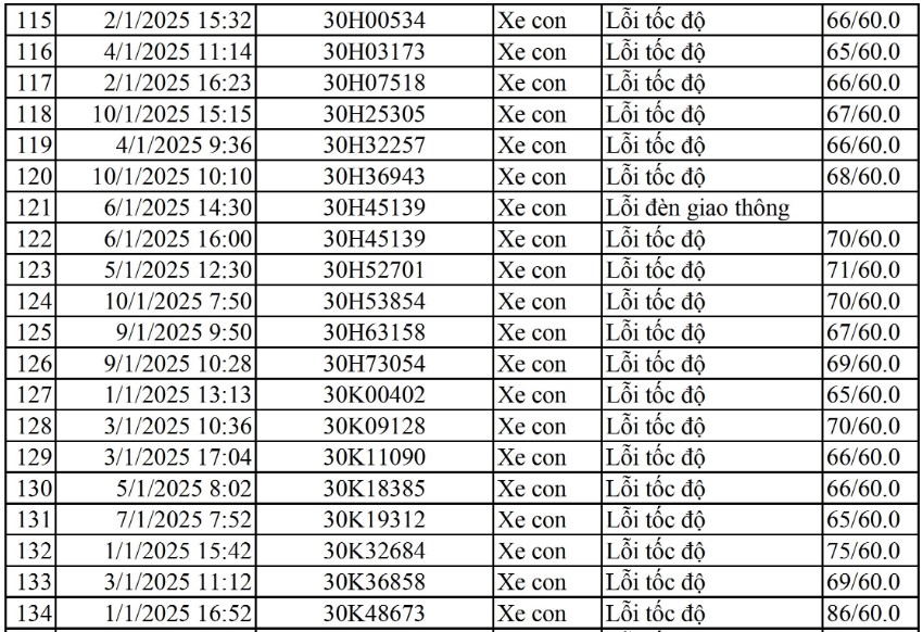 Tại Vĩnh Phúc, lực lượng Cảnh sát giao thông, Công an tỉnh Vĩnh Phúc đã công khai danh sách các phương tiện bị phạt nguội từ ngày 1/1/2025 đến 10/1/2025, trong đó, có không ít xe mang biển số Hà Nội vi phạm các lỗi như vượt đèn đỏ, chạy quá tốc độ quy định...